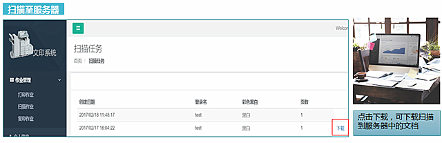 扫描到服务器:用户使用此功能时,可将文档直接扫描至系统后台,在后台使用此用户登录后,可下载该文档