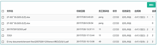 可统计打印复印扫描的作业日志。例如文件名称、员工名称、状态、任务属性、纸张数量、金额等信息。