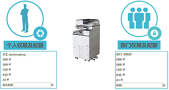 可针对个人和部门设置配额,当额度不够时,无法进行打印 |
